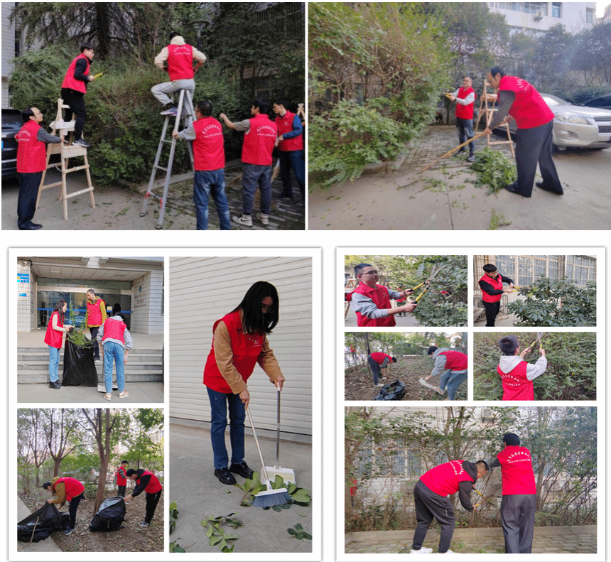 楼前花园的灌木进行修剪和清扫,经过一个多小时的紧张劳动,灌木被修剪整齐,地面杂物被清理干净,为全院师生创造了一个干净整洁的学习和工作环境。