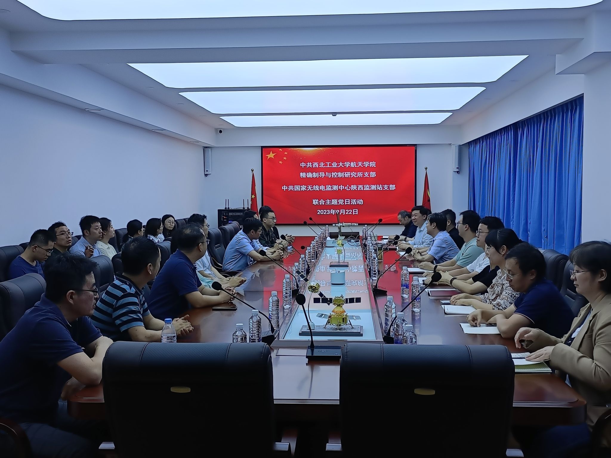 翱翔系列卫星和澳门科学卫星的研制过程和在轨运行情况,同时对我校在卫星测控站建设中得到国家无线电监测中心的支持表示感谢。国家无线电监测中心陕西监测站赵延安站长介绍了国家无线电监测中心陕西监测站的主要业务范围,并对在卫星天地通信业务的技术支持能力进行了详细的阐述。双方党员随后在陕西卫星星座的测控网络、卫星通信频段申请、秦岭资源探测和保护等方面进行了深入的交流和讨论。此次联合主题党日活动增强了我校与国家无线电监测中心陕西监测站的技术交流和党建合作,切实落实了主题教育与科研业务工作相结合的要求,双方愿为共同谱写中国式现代化建设的陕西新篇章而贡献力量。