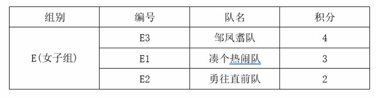 女子组,E3邹凤翥队以势不可当的魄力夺得冠军,E1凑个热闹队获得亚军,E2勇往直前队获得季军。