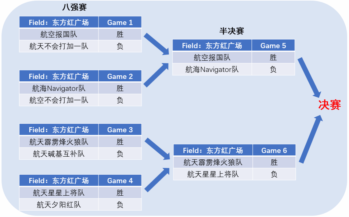 经过小组赛、八强赛的激烈比拼,A2航空报国队、B1航海Navigator队、C1航天霹雳烽火狼队、D2航天星星上将队成功晋级四强。随后,A2航空报国队和C1航天霹雳烽火狼队通过半决赛精彩的表现,成功闯入最终的冠亚军争夺赛。