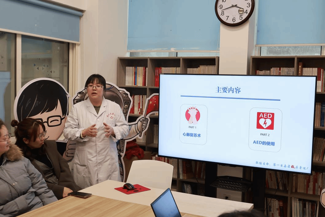 责任医师汤燕做了题为《急救知识与技能培训》的报告,详细为在场师生讲解了心肺复苏术的操作方法与要点,并对自动体外除颤仪(AED)的使用方法进行示范。
