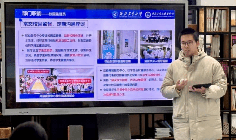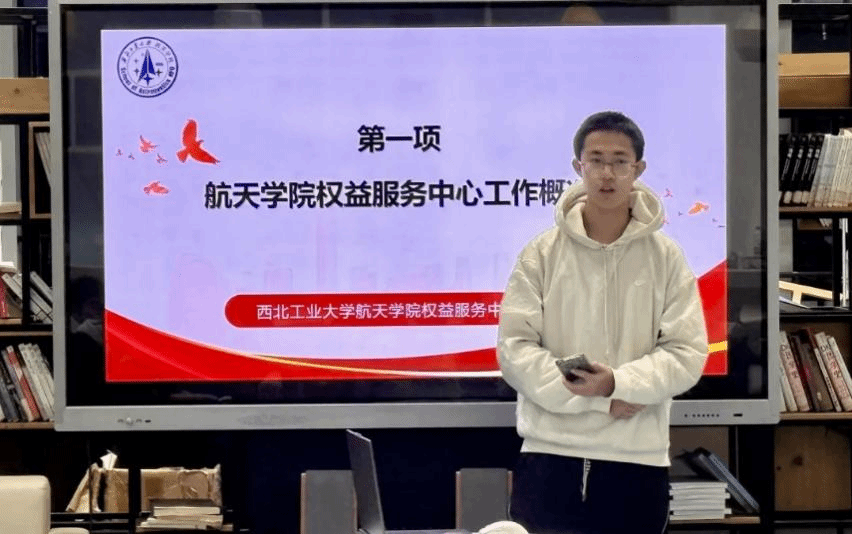 校学生会权益服务中心负责人王智铎向大家介绍了我校学生会权益服务中心的部门职能,普及了问题反馈渠道,展示了提案收集的方式以及至今所落实的成果。