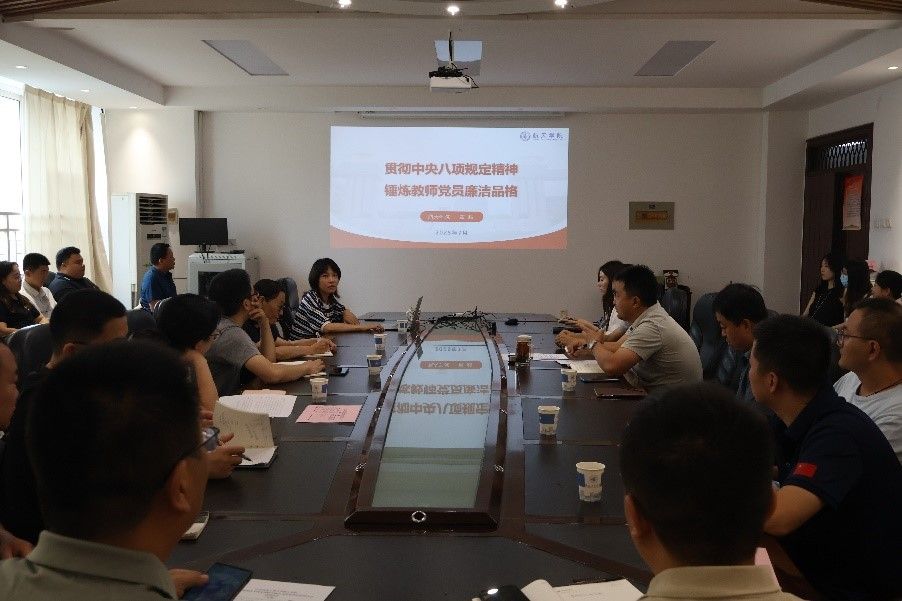 党委书记黄越以《贯彻中央八项规定精神 锤炼教师党员廉洁品格》为题讲授深入贯彻中央八项规定精神学习教育专题党课。学院教职工党支部师生党员代表、学院办公室全体工作人员参会。