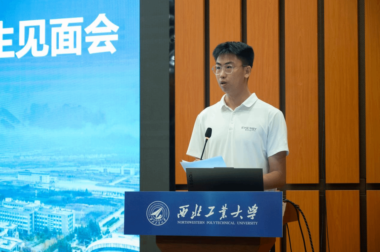 陈士橹飞天班吕恩豪同学发言。他分享了自己因“长征火箭”“神舟飞船”“飞天二号”等国之重器萌发航天梦想,最终选择西工大的初心,并代表全体新生表态:将以“公诚勇毅”校训为指引,以“三实一新”校风为准则,把个人理想融入国家航天事业发展,努力成为 “勇攀高峰的追梦人、国家战略科技力量的未来担当”。