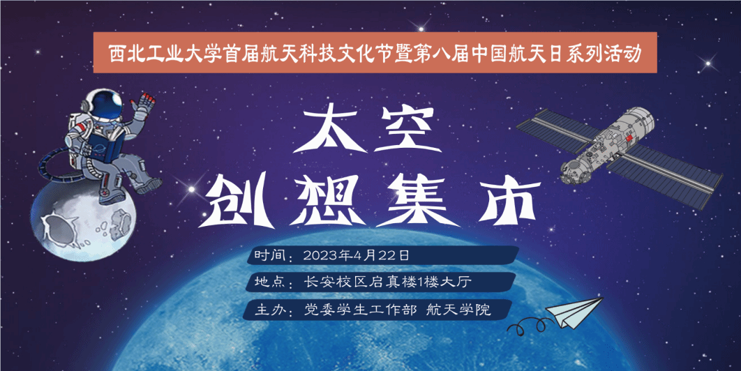 将于4月22日11:00在长安校区启真楼1楼大厅举办太空创想集市活动,通过多种形式的小游戏寓教于乐,让全校学子们在享受游戏欢乐的同时,了解航天文化,树立远大理想。